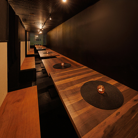 壁一面の黒と間接照明が織り成す落ち着きある空間は、まるで都会の喧騒を忘れさせてくれる隠れ家のよう!会社の宴会や歓送迎会、同窓会、打ち上げなど、幅広いシーンに対応できる万能空間です!