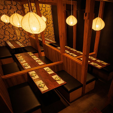 木のぬくもりとやわらかな照明が心地よい半個室!屋台のような活気と落ち着きを兼ね備えた空間です!のれんで区切られた半個室感が丁度良いプライベート感を演出!気軽で居心地の良い時間が流れます!