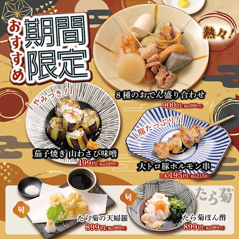 ☆たら菊の天婦羅989円☆たら菊ぽん酢989円☆8種のおでん盛り合わせ990円☆茄子焼き山わさび味噌549円☆大トロ豚ホルモン串(1本)215円※仕入れ状況により、内容を予告なく変更とさせて頂く場合がございます。