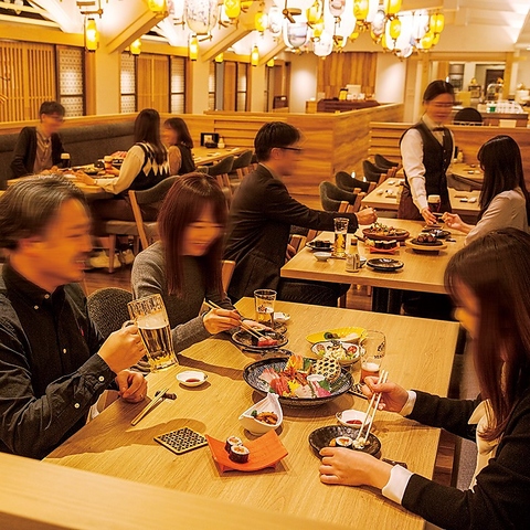 【最大40名様】開放感ある和食ビヤホール☆同窓会や宴会に皆様ゆったり楽しめるテーブル席。室内でありながらビアガーデンと和空間が融合した大人心を楽しませる空間で乾杯♪飲み放題付のコースもご用意。和食とビールを堪能いただけます。