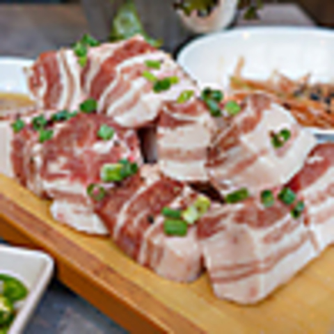 サムギョプサルと韓国料理!他にもチキンやサラダ、チゲにフルーツとバリエーションも納得。もちろんソフトドリンクバーもついてます♪