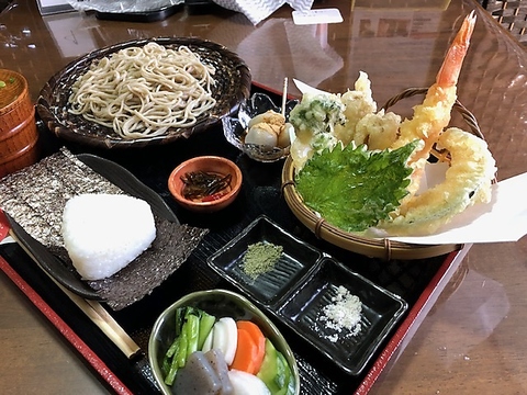 (もりそば/かけそば選択可)そば・天ぷら五品・おにぎり一個・漬物・そば白玉団子