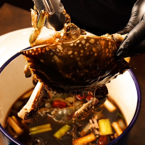 生のワタリガニを生きたまま、こだわりの特製の醤油だれに漬け込みました