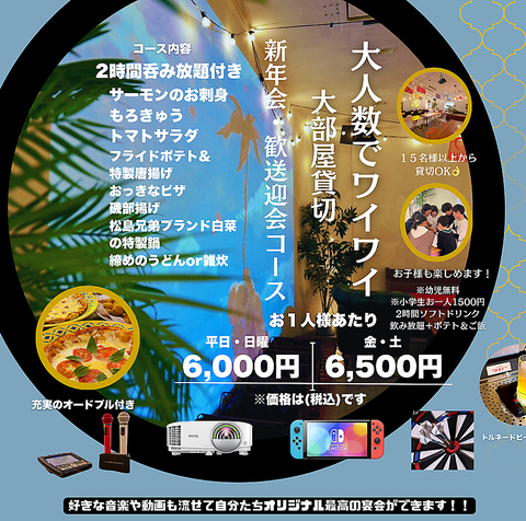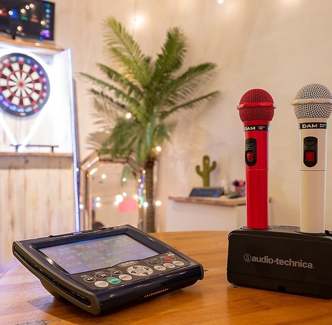 室内の宴会場では、ダーツ遊び放題、カラオケ歌い放題、プロジェクター、Swichなどなど幅広く取り揃えております!テント席でもカードゲーム等貸出可能です♪2次会セットとしてカラオケ歌い放題やダーツ遊び放題などもセットになったお得なコースもご用意しておりますので、ぜひそちらもご利用下さい◎