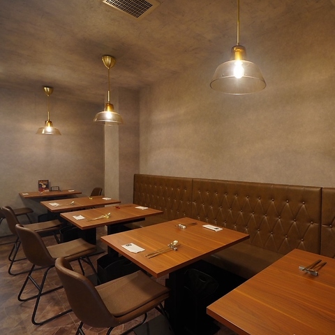 【お洒落で落ち着く店内☆】店内はグレーとダークブラウンを基調としたおしゃれな空間♪BGMはK-popではなく落ち着いた音楽が流れ、リラックスできる大人向けの雰囲気が漂います◎大きめの2名様用テーブルの他に最大6名様まで座れるソファ席を2卓完備♪貸切や団体のお客様も対応可能なのでお気軽にご相談ください♪