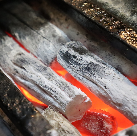 香りの食材への移り方は、使う炭によって異なります。特定の職人が手作業で炭化させた、非常に高密度な炭。打ち合った時の甲高い音が、それを物語ります。原木は高級炭の原木として名高いウバメガシ。焼きに影響する炭の太さも0.1mm単位でこだわって仕入れています。