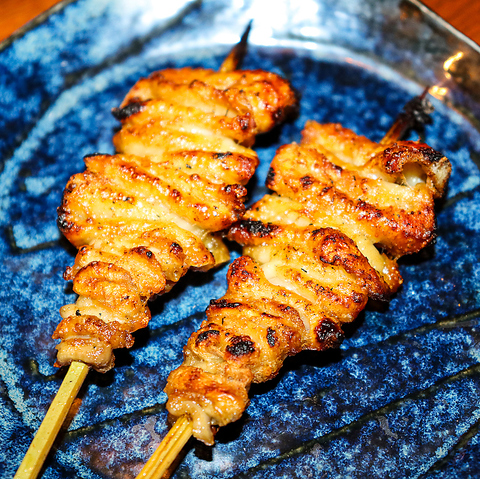 当店は阿波尾鶏の首皮を使用。下処理として茹で上げるお店がございますが、当店では鮮度の良いもののみを仕入れしているため、生肉の状態にて串うちをします。外はカリッと、中は食べ応えのある弾力を味わっていただくため、焼きには細心の注意を払います。