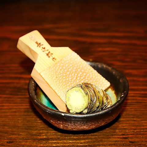 静岡県のわさび農家より直仕入れする、生わさび。すりたてならではの香りと風味を、当店のお料理と一緒に味わっていただきたい想いから提供しております。※原則、1卓におひとつまでとさせていただいております。