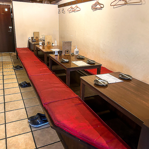 【掘りごたつは2,3名~最大20名様まで着席可能】4名席が4卓並んだ掘りごたつのお席は、少人数の飲み会から団体でのご宴会まで幅広いシーンでご利用いただけます。柔らかいシートがフラットに並んだお席は、お子様連れのお客様でも安心してお食事いただけます。
