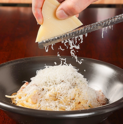 目の前でチーズをふわふわに削り、新鮮なチーズの香りが広がります。食感の良いパスタに、濃厚なカルボナーラソース。カルボナーラ好きには是非食べてほしい一品。