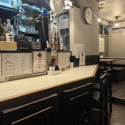 【大人なカウンター席】程よい距離感と落ち着いた照明が魅力の、大人のためのカウンター席。静かにグラスを傾けながら、店主との会話や料理の音を楽しむ贅沢な時間が流れます。一人でも、二人でも、肩の力を抜いて過ごせる特別な場所。上質なひとときを演出する、居酒屋の隠れた特等席です。