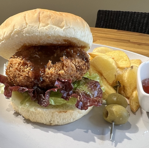 お昼限定(11時~17時)の大人気メニューの松阪牛メンチカツバーガー!フライドポテト付きです。