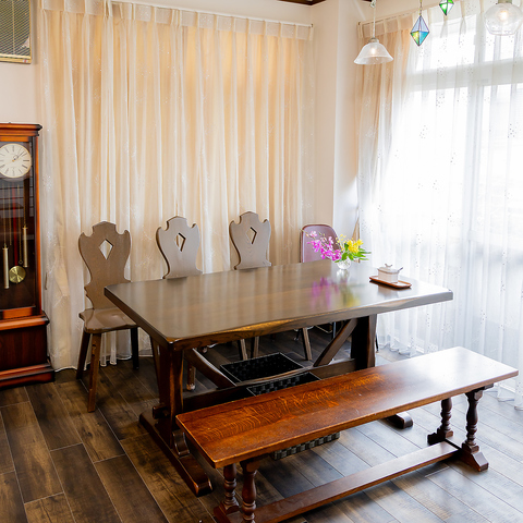 広々とした店内の空間は、窓部分が大きく外光が射しこみ、ガラス作家による灯りも優しく灯し、手作りのスピーカー、時間を知らせる柱時計、白い壁に、落ち着いたブラウンのテーブルと椅子のあるカフェスペースです。ご来店者からは、落ち着く空間とのお声を頂戴しております。