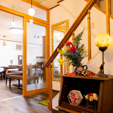 入口には薔薇の鏡がやわらかな光を映しながら、訪れる人をそっとお出迎えしてくれます。また店内にはこだわりのインテリアや吹きガラスの灯りもあたたかで心地よい空間となっております