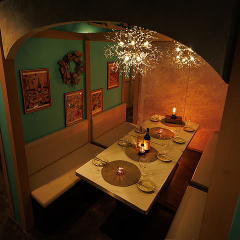大切な方とのプライベートな時間を存分にお楽しみいただくため、当店では、全席完全個室にて皆様を極上の美食空間へとご案内いたします。ターコイズブルーの世界観で統一した店内は、カジュアルさと高級感を併せ持つ、「かわいいだけじゃない、秘密にしたくなるビストロに。2名様用のカップルシートから大人数個室まで多彩!