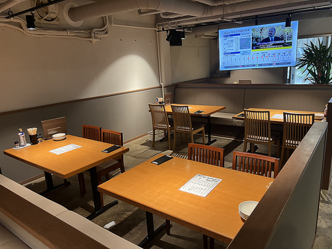 大型のテレビがあり野球、サッカーライブなど見ながらお食事ができます。友人やご家族でのお食事、会社帰りのご宴会などグループで利用しやすいテーブル席をご用意しております。テーブルはぶつかって卓上の料理が倒れないよう安全性を高めるため床に固定しています。