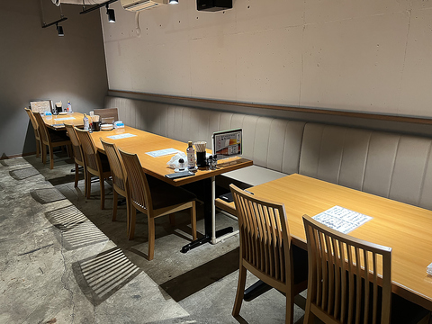 友人やご家族でのお食事、会社帰りのご宴会など、グループで利用しやすいテーブル席をご用意しております。テーブルはぶつかって卓上の料理が倒れないよう安全性を高めるため床に固定しています。テーブル2~45名様とカウンター席7名様のお席をご用意しております。