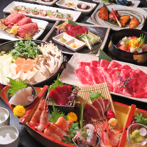 各種宴会にうってつけ!鮮魚舟盛り・仙台牛すき焼き・鰻巻き・厚切り特上牛タン炭火焼き・海鮮バラちらし等こだわりの料理をつめこんだ全9品のボリューム満点贅沢宴会コース♪充実内容のアサヒ熟撰・地酒(伯楽星、久保田、墨廼江等)9種付き豪華120分飲み放題