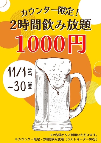 【11/1~30】カウンター限定!2時間飲み放題1000円です♪この機会をお見逃しなく!※2名様~