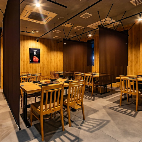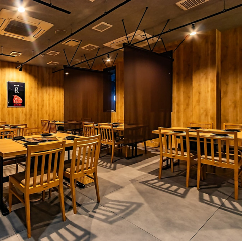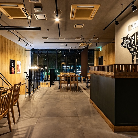 ≪開放感のある贅沢な店内≫リゾートホテルのお洒落なカフェのような店内は、モノトーンと木目調を基調としたモダンでシックな雰囲気です◎リーズナブルに贅沢な焼肉を堪能♪服や髪に臭いが付かず完全に煙の出ないロースターで、上質なお肉が今まで見たことがないほどの【ふっくらでヘルシーなお肉】にグレードアップ!