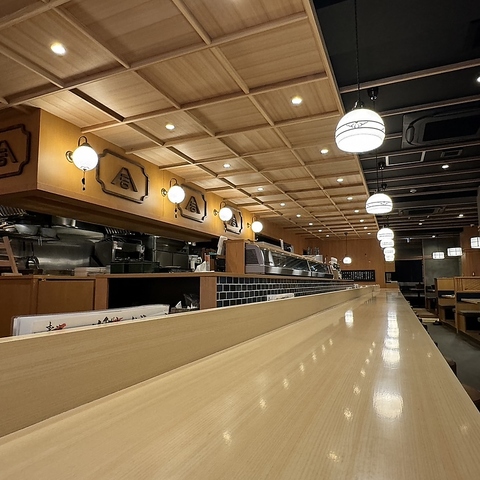 白木を使用した和の落ち着いた雰囲気。カウンター席・テーブル席・半個室を完備。明るく開放感あふれる店内。ちょい飲みからコースまで多彩なシーンでご利用いただけます。