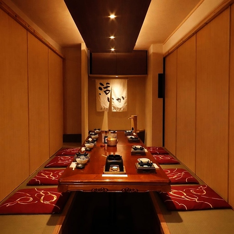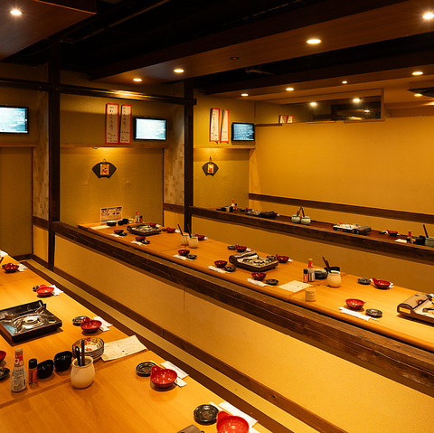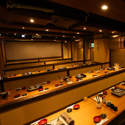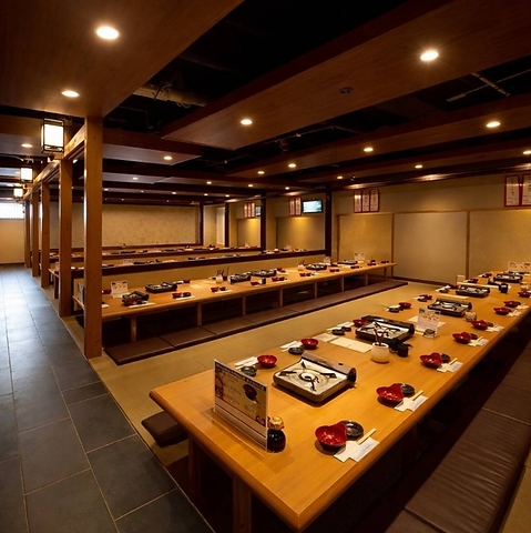 全席完全個室の掘りごたつ席。落ち着いた和の空間でゆったりお食事をお楽しみいただけます。少人数のご利用からご宴会まで対応。最大118名様までご案内可能です。