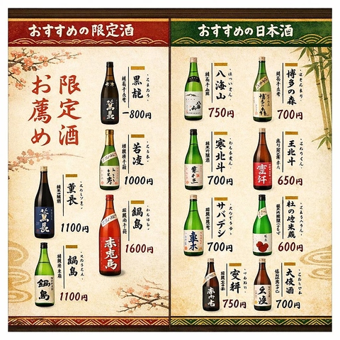 福岡の地酒を中心に豊富な日本酒をご用意。名物いかの活き造りや新鮮な海鮮料理とともに、料理に合う一杯をお楽しみいただけます。