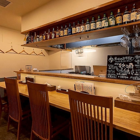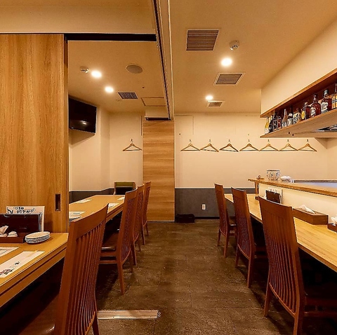 サク飲みやデートにも◎木のぬくもりが温かい、広々としたカウンター席です。