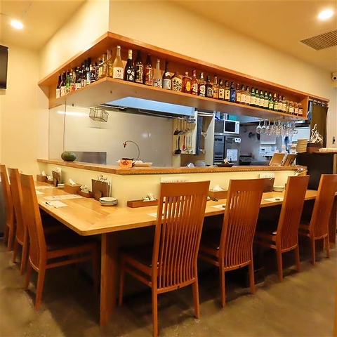 【カウンター】お店のスタッフとの会話やお料理をしている所がすぐ近くで楽しめる。そんなライブ感たっぷりのカウンターは、広々としていて落ちついていながらも、肩肘を張らずお酒と会話を楽しめるラフな空間です。