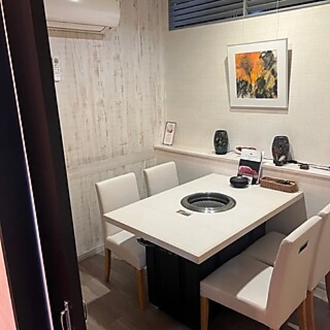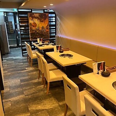 客席はゆとりをもって配置されており、4人掛けのテーブル席が中心です。テーブル間のスペースも十分に確保されているため、隣席を気にせずゆったりと焼肉を楽しめます。靴を脱がずに座れるチェアシートで足元も楽に過ごせ、落ち着いて食事ができる開放的な雰囲気です。
