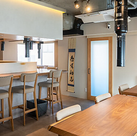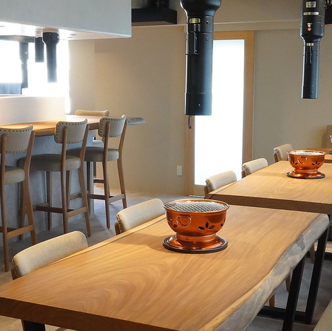 少人数で落ち着けるアサメラの木を使用したカウンター席やテーブル席を完備。上質で落ち着いた雰囲気は特別感を高め、デートや親しい人との食事にも最適です。視覚的にも美しい盛り付けが光る焼肉を、ゆったりと楽しむことができます。細やかな配慮で安心できる空間をご提供いたします。