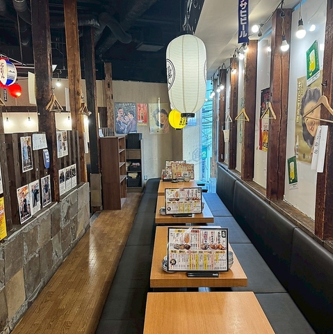 【大衆居酒屋】お祭り気分になれると好評の内装です!自慢の居酒屋料理と激安ドリンク何杯でもゆったり堪能出来るように、テーブル席、ソファー席などレイアウト様々に、多種多様なお席をご用意!名物のやきとりは絶対食べてくれ