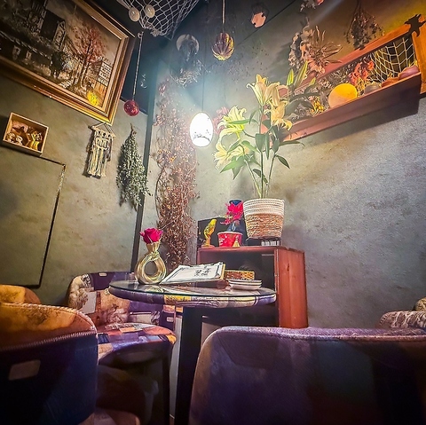 周囲をドライフラワーで彩り癒しの空間となる店内はくつろぎのひとときをお楽しみいただけます。こだわりのある店内の内装に繊細な花々が優しく出迎えてくれ、心を和ませます◎
