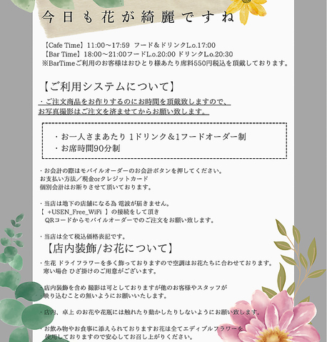 花に囲まれた当店は、サプライズ演出にも対応いたしております。特に女子会やデートにピッタリです♪オシャレな雰囲気作りで、来ていただいたお客様に満足していただけるよう笑顔とおもてなしの気持ちで、お客さまをお迎えしております。