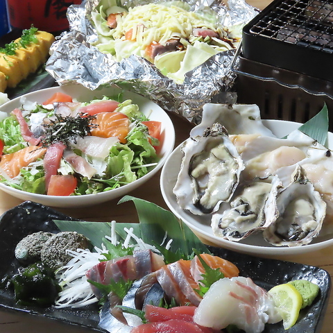 新鮮な刺身5種盛りや焼き牡蠣・ホタテをはじめとした9品と、飲み放題が付いた5000円(税込)のコースです!海鮮の他におつまみの定番のだし巻き卵や若鶏せせり焼きなども楽しめる☆美味しいお酒もご用意しております。楽しいひとときをお過ごしください♪