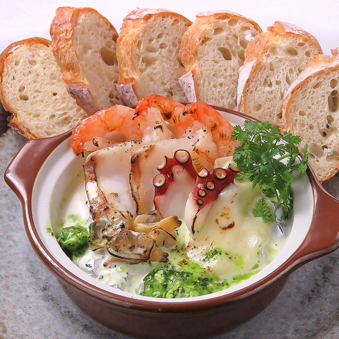 フランス料理の『エスカルゴブルギニョン』を日本風にアレンジ。旬の魚介を贅沢に使用し、ミックスチーズやブルゴーニュバター、特製アンチョビソースの深みが味を引き立てます。海の滋味を堪能できる逸品です。