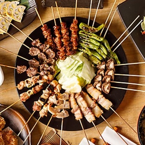 お野菜をお肉で巻いた「野菜捲き串」。毎日手作りで串打ちした自慢の1串!レタス巻き、博多万能ネギ巻き、れんこん巻き、アスパラ巻き、トマト巻きなど豊富なラインナップでご用意!ジューシーなお肉と新鮮で甘みのあるお野菜の相性は抜群!