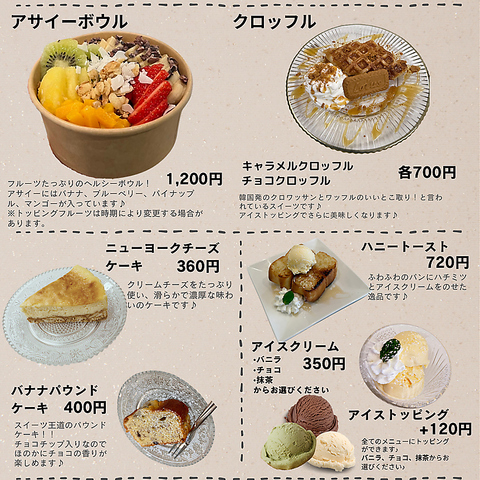 ◆大人気スイーツアサイーボウルやクロッフル、その他多くの人気スイーツを用意してます写真映えする店内でスイーツをクロッフル(チョコ味、キャラメル味)アイストッピングがおすすめです♪