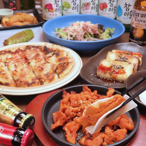 チキン&ビールNeoKoreanダイニングMushroomのお料理は、看板料理のスパイシーチキンからキンパやチヂミ、コチュジャンプルコギなど定番人気韓国料理が勢揃い!旨辛で一度食べたらやみつきに!