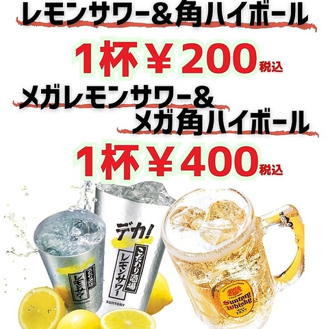 平日限定でハッピーアワー開催中!平日19時まで、レモンサワー&角ハイボール1杯200円!メガは1杯400円!