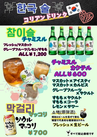 | 韓国酒 | チャミスル(フレッシュ/すもも/ピーチ/マスカット/ストロベリー)/ソウルマッコリ |