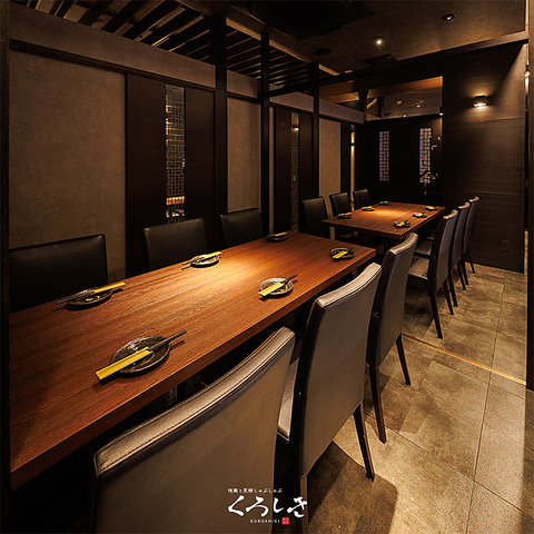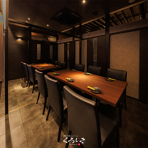 [8~12名様]ゆったり寛げる広々とした扉付き個室。テーブルとシックなチェアが並び、宴会や仲間との集まりに最適。広々とした造りながらも、プライベート感を保ち、周囲を気にせず会話を愉しめます。