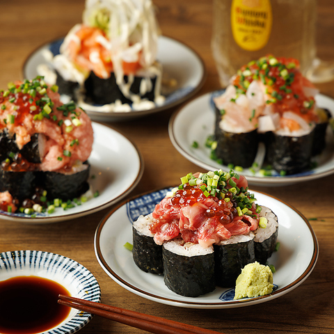 オススメの寿司メニュー!厳選和牛を使用した肉手毬寿司・和牛と鮮度抜群の魚介をたっぷりのせた和牛海鮮巻き寿司・さらに豪快に海鮮があふれる海鮮こぼれ寿司!どれも食べ応え抜群な自慢の逸品です!