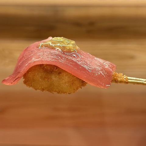 新感覚!赤酢のシャリを揚げております。新鮮な寿司ネタを豪快に乗せてご提供♪定番4種…マグロと茎わさび寿司串揚げ/エビマヨ炙り寿司串揚げ/サーモンいくら寿司串揚げ/煮穴子寿司串揚げ ■期間限定3種類…生ハム寿司串揚げ~トリュフソース~/出汁巻き寿司串揚げ/ネギトロ寿司串揚げ