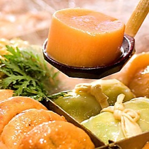 南国の地、鹿児島に「なぜおでん?」と思われるかもしれませんが、先代から受け継がれ、70余年、つぎたしつぎたし受け継いでいる伝統の味です。これまで休むことなく、その味を守ってきました。色が琥珀色で白味噌仕立て。ネタは、鹿児島の食材をふんだんに使用。受け継がれた秘伝の味を是非ご賞味ください。