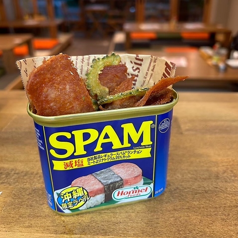 はなぐすくのオリジナルメニュー!沖縄の名物「スパム」がからっと揚げられたカツに大変身!塩味のあるスパムと衣の甘さがマッチして、おつまみにもぴったりです★スパム缶に入ってる見た目も可愛いので、ぜひお写真撮ってくださいね♪他にも王道スパム玉子やスパムチップス★