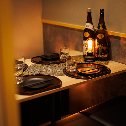 全国各地の焼酎・日本酒を豊富にご用意!しっとりとした和モダンな空間に、間接照明の優しい灯りに包まれる完全個室!焼酎好きにはたまらないラインナップと、手に取りたくなるグラスの並びが絵になる一枚!少人数でも気兼ねなくくつろげるテーブルで、デートも、友人との飲み会にも◎♪心ゆくまでお楽しみください!