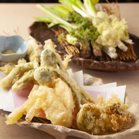山菜特有の繊細な苦みは、旨味ある富山の地酒と相性抜群です。素材の持ち味を活かすため、衣は薄く、油切れよく。添えられたお塩が山菜の甘みを引き立てます。静かな夜に、季節の移ろいを感じる一献をいかがですか。