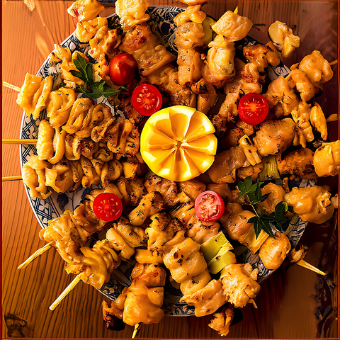 自慢の焼鳥は厳選した新鮮な地鶏を使い、料理長自らその日の毎朝丁寧に串打ちしております。脂肪が少なく、キュッと締まった肉質の地鶏は、適度な弾力と口の中いっぱいに溢れ出す肉汁の旨味に虜になるお客様が続出しています♪備長炭でじっくりと火を通した、渾身の"一串"をご堪能下さい!!焼き鳥は飲み放題付きコースでもお楽しみいただけます◎