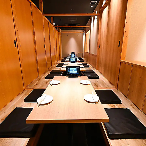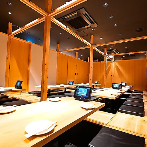 宴会に最適のくつろぎ空間の宴会個室。当店は数あるパターンのお席を全席掘りごたつ席でご用意しております。送別会、歓迎会、宴会に最適のくつろぎ空間の宴会個室や少人数のプライベート空間もございます。雰囲気を楽しみながら各種取り揃えた酒と本格料理をお愉しみください。